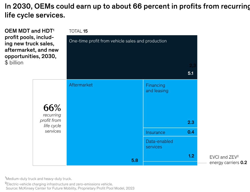 Según esta entidad, los camiones van a dejar de venderse según el modo tradicional, como un simple vehículo. No tardando mucho, será imprescindible que los fabricantes amplíen sus ofertas para incluir nuevas formas de añadir valor, como la gestión de flotas, la gestión del tiempo de actividad y la infraestructura de recarga. Las nuevas ofertas serán más complejas, integradas y caras.