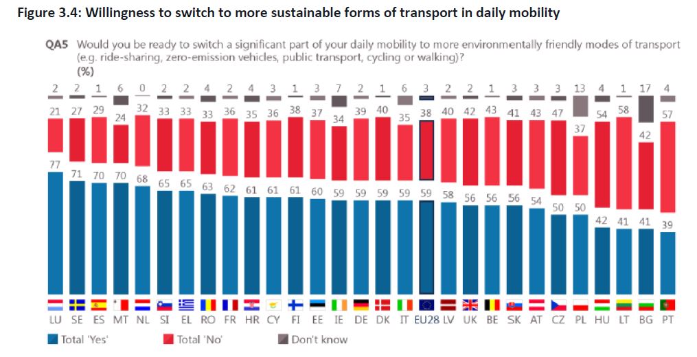 Disposición a cambiar a modos de transporte más sostenibles en la movilidad diaria: a nivel de la UE, el 59% de los encuestados dijo estar dispuesto a adoptar modos de transporte más respetuosos con el medio ambiente, sin diferencias en función del género o los ingresos. Sin embargo, los encuestados más jóvenes eran más propensos a estar dispuestos a cambiar (70% de los jóvenes de 15 a 24 años) en comparación con las personas mayores (53% de los mayores de 55 años). Los encuestados que viven en ciudades son más propensos a estar dispuestos a (63%) que los de las zonas rurales (55%). En 24 países, al menos la mitad de los usuarios habituales de automóviles se declararon dispuestos a cambiar, aunque hubo una variación considerable.