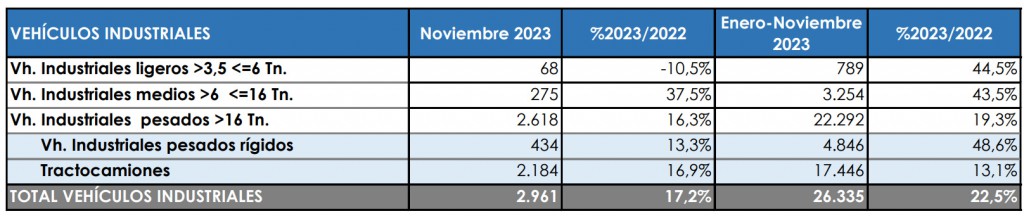 En cuanto a los vehículos Industriales, el undécimo dato mensual también fue favorable, con un total de 2.961 unidades (100 menos que en octubre) que significan una subida del +17,2% respecto a noviembre de 2022. Así, el acumulado anual se sitúa en 26.335 vehículos, subiendo un +22,5% (casi parejo respecto al mes precedente).