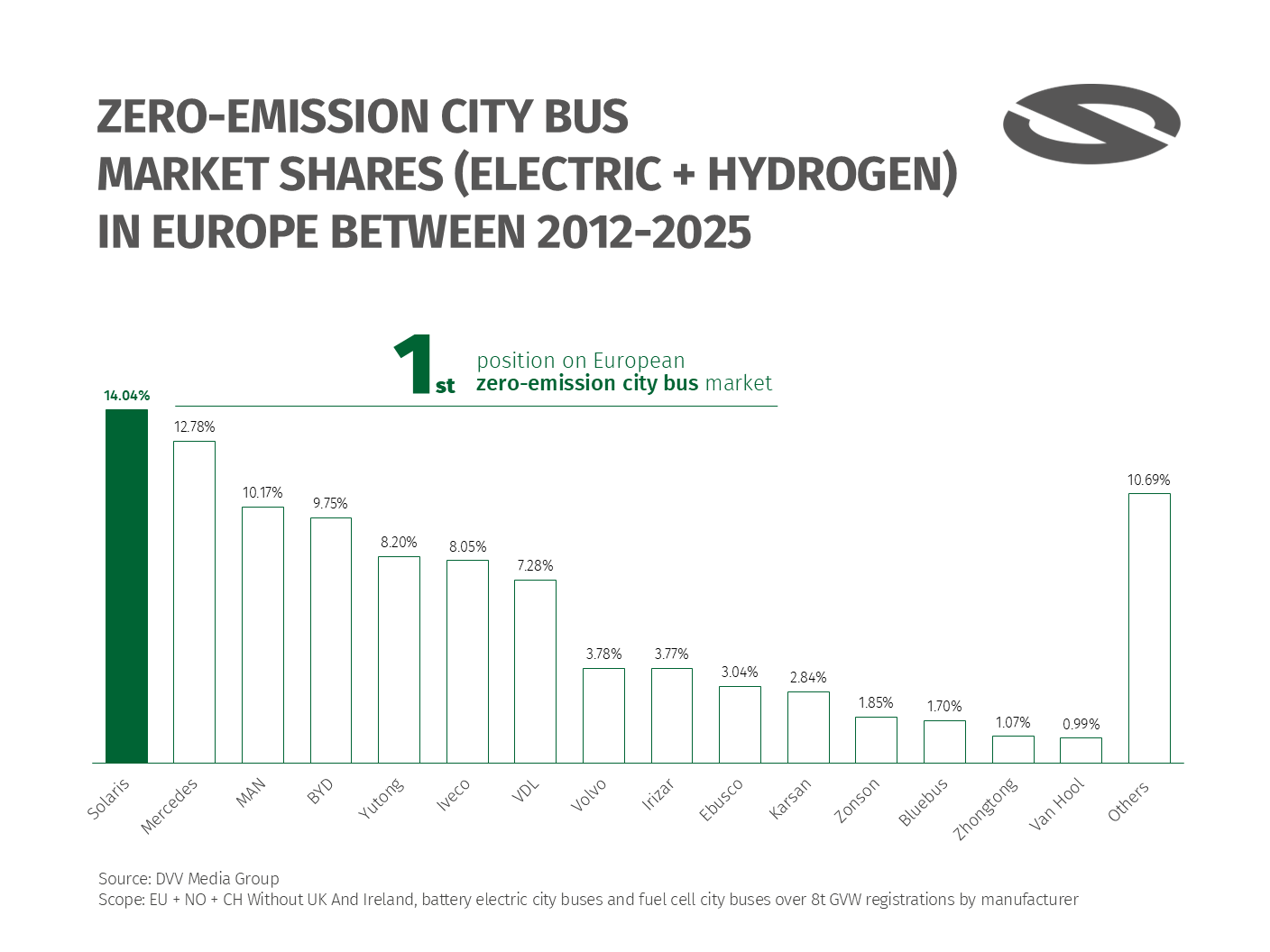Gracias a estos resultados, Solaris logró una cuota del 11% en el mercado europeo de autobuses eléctricos y un destacado 58% en el segmento de hidrógeno. En conjunto, el fabricante se situó como el tercer mayor actor en Europa en autobuses urbanos de cero emisiones, con cerca de un 14% de cuota de mercado.