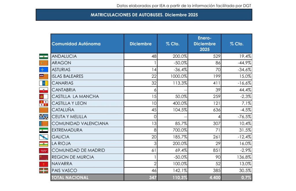 Las matriculaciones de autobuses y microbuses se disparan un 110,3% en diciembre, aunque el crecimiento acumulado anual es del 0,7% El sector de autobuses, autocares y microbuses registró un fuerte impulso en diciembre, con un crecimiento del 110,3% interanual y un total de 347 unidades matriculadas. Sin embargo, el balance del año 2025 apenas mejora, […]