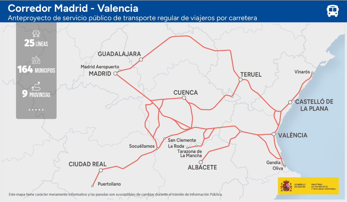La nueva propuesta conectará 164 municipios de nueve provincias: Madrid, Valencia, Cuenca, Guadalajara, Teruel, Castellón, Ciudad Real, Albacete y Toledo, beneficiando a más de 6,2 millones de ciudadanos. Además, mantiene todas las paradas actualmente en servicio, con el objetivo de garantizar la continuidad del transporte público en los territorios afectados.