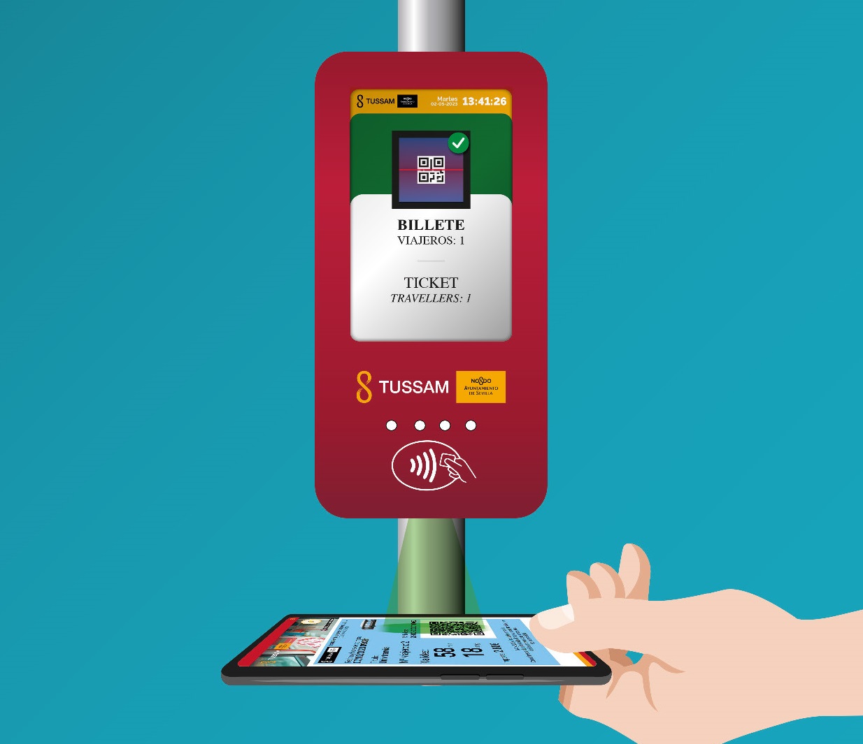 4. El billete debe validarse en las canceladoras del vehículo. Para ello, mantenga el móvil con el billete QR en pantalla (hacia arriba) por debajo del equipo de validación, a unos 10 cm ó más del mismo, hasta que vea en la pantalla de la canceladora que lo acepta correctamente.