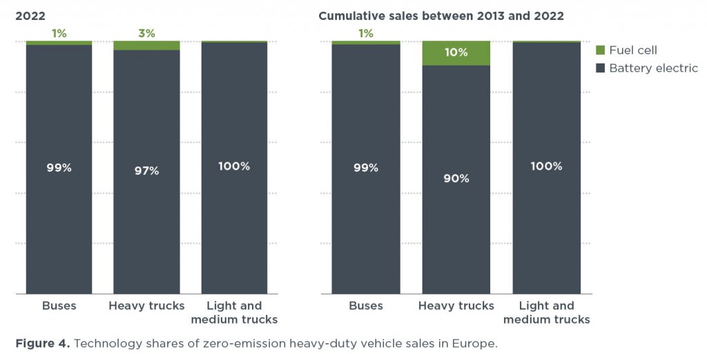 Los eléctricos de batería dominaron las ventas en todos los tipos de vehículos con más de 5.000 ventas en 2022, con una pequeña y decreciente cuota de vehículos de pila de combustible de hidrógeno en los sectores de autobuses y camiones pesados (100 ventas). Casi todos los vehículos pesados de pila de combustible se vendieron en Alemania y los Países Bajos en 2022. La mayoría de los camiones de pila de combustible tenían una configuración de ejes 6×2, mientras que los camiones 4×2 representaban la gran mayoría de las ventas de camiones convencionales. La venta de vehículos pesados eléctricos de batería ZE-HDV fue mucho más heterogénea entre los Estados miembros que la de vehículos de pila de combustible; aproximadamente la mitad de las ventas de camiones pesados eléctricos de batería tenían una configuración de ejes 4×2, y casi todos los camiones restantes eran 6×2”.