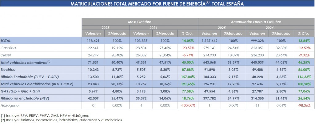 Los híbridos convencionales (HEV) también mantienen su liderazgo con 42.009 matriculaciones en octubre, lo que representa el 35,5% del mercado en ese mes. En el acumulado anual ya suman 397.782 unidades, un 26,5% más que en 2024.Por su parte, los vehículos propulsados por gas (GLP, GNC, GNL) registraron un repunte del 77,6% en octubre, con 5.679 unidades matriculadas, y acumulan un crecimiento anual del 77%, con 49.554 unidades.En términos generales, los vehículos de tecnologías alternativas (electrificados, híbridos y de gas) representaron el 60,4% de todas las matriculaciones de octubre, con 71.531 unidades, y acumulan un 56,6% del mercado en lo que va de 2025.