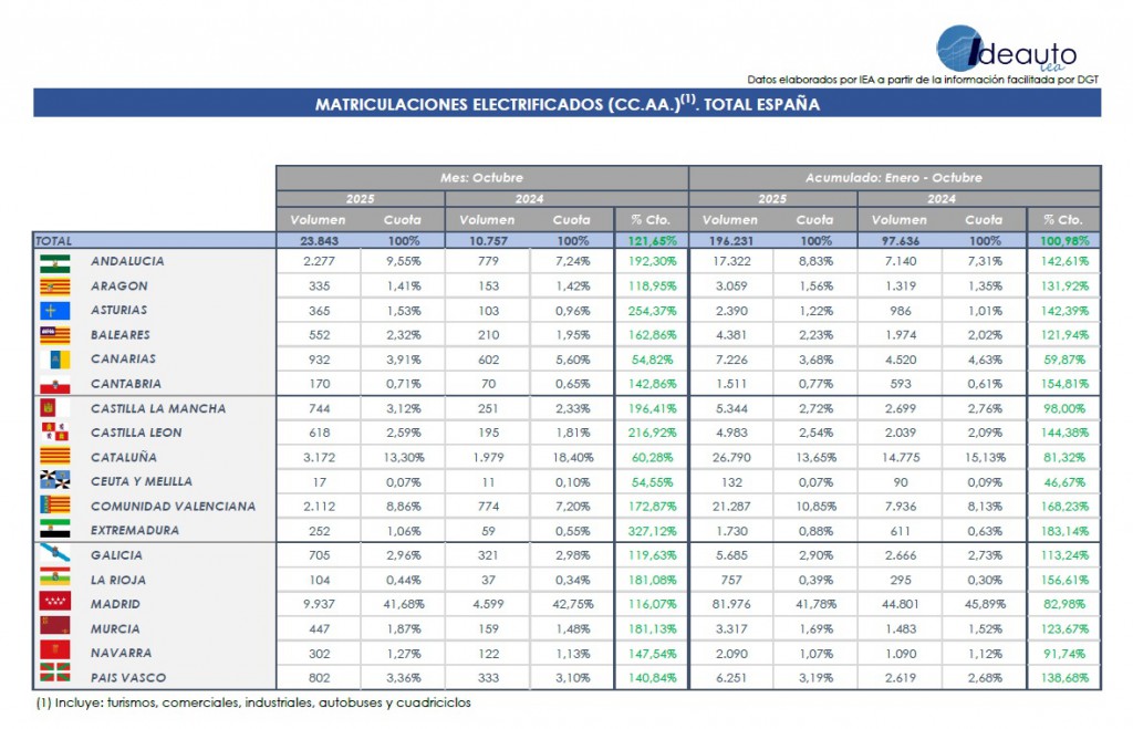 El mercado español de vehículos electrificados continúa su avance imparable. En octubre se matricularon 23.843 unidades de eléctricos puros e híbridos enchufables, lo que supone un crecimiento del 121,6% respecto al mismo mes de 2024 y una cuota del 20,1% del total del mercado. Con estas cifras, el acumulado del año asciende ya a 196.231 vehículos, un 101% más que el año anterior.